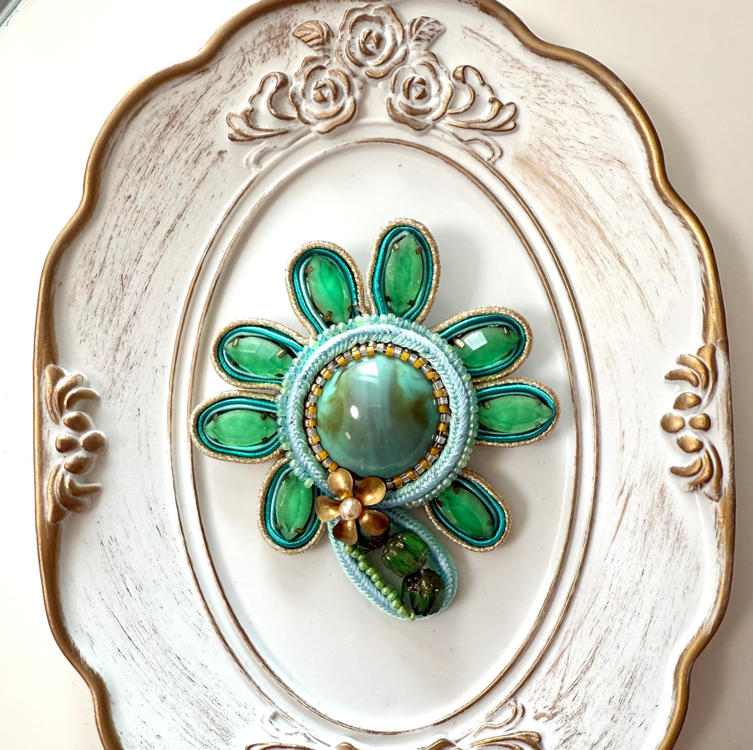 7×7.5cm マーブル模様のカボションの周りをエメラルドグリーンの花びらが囲っている愛らしいデザインです。